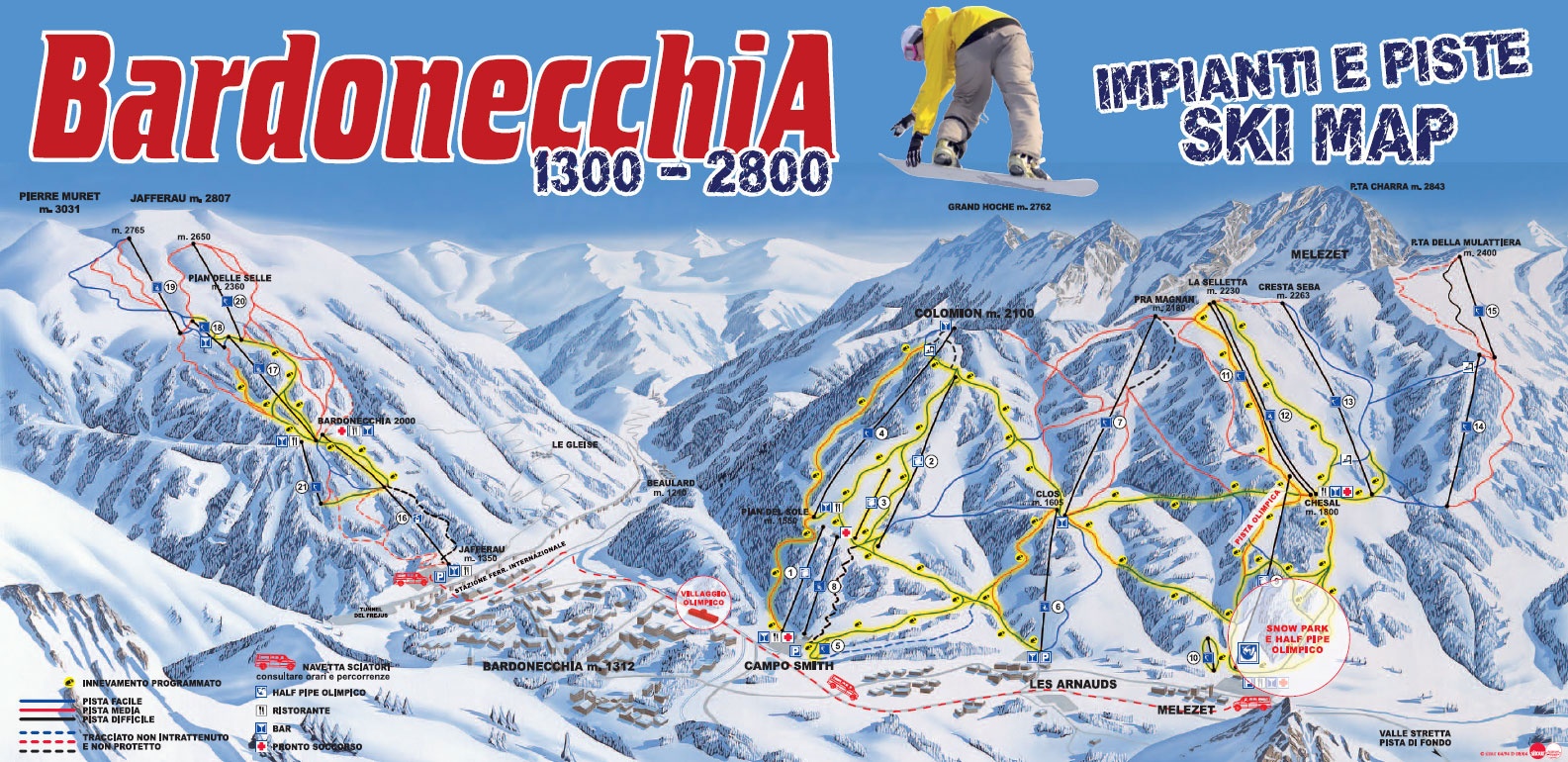 Lyžařské středisko Bardonecchia leží v západní části Piemonte ve výšce 1 312 m, obklopeno slunečným údolím a vrcholky, které sahají až do výšky 3 500 m. Obkopují ho čtyři údolí - Rochemolles, Frejus, Rho-Melezet a Strettské údolí a patří do oblasti Val di Susa. Zdejší středisko je jedním z nejoblíbenějších v celé Itálie a co se týče zimních sportů, má dlouholetou tradici. Už v roce 1909 byla Bardonecchia dějištěm prvního italského mistrovství v lyžování. Lyžařský areál tvoří čtyři samostatná střediska: Rochemolles, Millaures, Melezet a Les Arnauds, z nichž každé má svou vlastní historii. Středisko také bylo jednou z prvních destinací zimních dovolených v oblasti Piemont. Lyžuje se především na severních sjezdovkách, charakteristická svými vynikajícími podmínkami pro snowboarding je vesnička Melezet. Bardonecchia je navíc proslavena svým skvělým freeridovým lyžováním na Mount Jafferau, kde jsou sjezdovky o něco náročnější. Rochemolles je známo jako Colomion a je připojeno ke dvěma dalším lyžařským resortům - "Les Arnauds" a "Melezet", jejichž sjezdovky vedou převážně lesem. Výchozím bodem pro tuto oblast je Campo Smith, odkud vás lanovky dopraví až do výšky 2 400 m.n.m. Jen 5 minut od centra města se nachází další hlavní lyžařská oblast - Lo Jafferau, ke které se můžete dostat bezplatným skibusem. Ta nabízí lyžování v otevřené krajině s výhledem na okolní hory a to v nadmořské výšce 2 800 m. Při lyžování mimo sjezdovky je vždy důležité být si vědom rizika lavin, takže nezapomeňte kontaktovat různé lyžařské a snowboardové školy pro další informace o lavinovém nebezpečí.