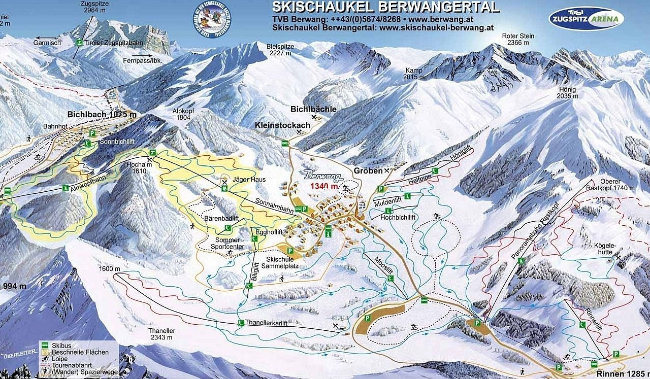 Lyžařský středisko ve městě Berwang není příliš velký lyžařský areál, ve kterém je nutné mít oči "přilepené" na vaše děti a neustále je mít pod dohledem. Ale moderní lyžařský areál, jehož velikost je vhodná zejména pro rodiny s dětmi, kteří se zde cítí v pohodě. V nadmořské výšce 1 336 m nad mořem si tak mohou dokonale odpočinout a obklopeni nádhernou zimní krajinou tak načerpat nové síly. Nicméně, lyžařský areál spojuje vesnice Bichlbach Berwang a Rinnen a je populární zejména díky zdejších Dětských lyžařských dní. Co se týká lyžování v lyžařském středisku Skischaukel Berwangertal, s "Top Snow Card" získáte přístup k dalším deseti lyžařským střediskům a dohromady k 215 km sjezdovek a 87 lanovkám a vlekům. Mezi nimi se mimo jiné nachází i proslulý Garmisch - Partenkirchen na německé straně a Lermoos, Ehrwald a Mittenwald na rakouské straně. Berwang (nejvyšší středisko v areálu Tiroler Zugspitz Arena) nabízí lyžařskou houpačkou Berwangertal, která zahrnuje 36 km sjezdovek a 12 lanovek a vleků. Úchvatná je pak prostě slunná vysokohorská poloha na alpském přechodu mezi Zugspitze a Lechtalem. Oblíbenou lanovkou Sonnenalm se také dostanete na nejen obtížné sjezdovky pro carvingové obloučky, ale i snowboardisté zde mohou experimentovat na 80 m dlouhé rampě u Hönigliftu. K tomu se přidají sjezdovky přímo před domem, svahy s hlubokým sněhem, záruka sněhu a zimní stezky, o rodiny s dětmi tu bude také dobře postaráno... no ne nadarmo se na tomto slunném koutě potkávají jak začátečníci, tak i zkušení lyžaři.