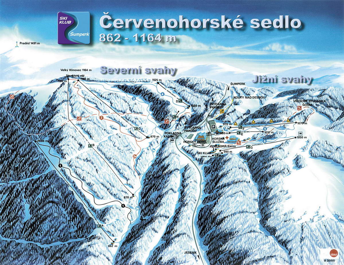 V lyžařském areálu Červenohorského sedla je návštěvníkům k dispozici celkem 8 vleků, 10 sjezdovek a dvě cvičné lyžařské louky. Areál, jehož sjezdovky jsou rozděleny na severní a jižní svahy, jsou pravidelně (každý den) upravovány sněžnými stroji. Zkušenějším lyžařům jsou určeny severní svahy, jižní svahy jsou spíše cvičné, které jsou určené pro začátečníky. Ze tří severních sjezdovek je nejdelší černá - "Slalomový svah" (celková délka 800 metrů, nacházející se u vleku Tartapoma H130), doplněná o červenou (o délce 1 100 m, vedoucí po svazích Velkého Klínovce) a 2 modré sjezdovky. Ty se nacházejí na jižních svazích a označené jsou jako "Louka I." a "Louka II.". Sjezdové tratě jsou pravidelně zasněžovány. V lyžařském středisku můžete lyžovat každý den od 8:30 do 16:00 hodin, noční lyžování, které je možné provozovat na jižním svahu, se koná od 18:00 do 21:00 hodin. Zakoupit zde můžete časové i bodové jízdenky. Přímo v sedle se můžete také občerstvit a to v hotelu Červenohorské sedlo. Parkovat můžete na parkovišti přímo v Červenohorském sedle, v případě přeplněného parkoviště je pak možné parkovat na záchytném parkovišti v Koutech nad Desnou. Odkud je také organizována kyvadlová doprava. Velmi kvalitní zázemí poskytují také obce Bělá pod Pradědem a Loučná nad Desnou. Na Červenohorském sedle má svou základnu také Jesenická horská služba. Také upozorňujeme, že je přísně zakázáno lyžovat mimo vyznačené sjezdovky.