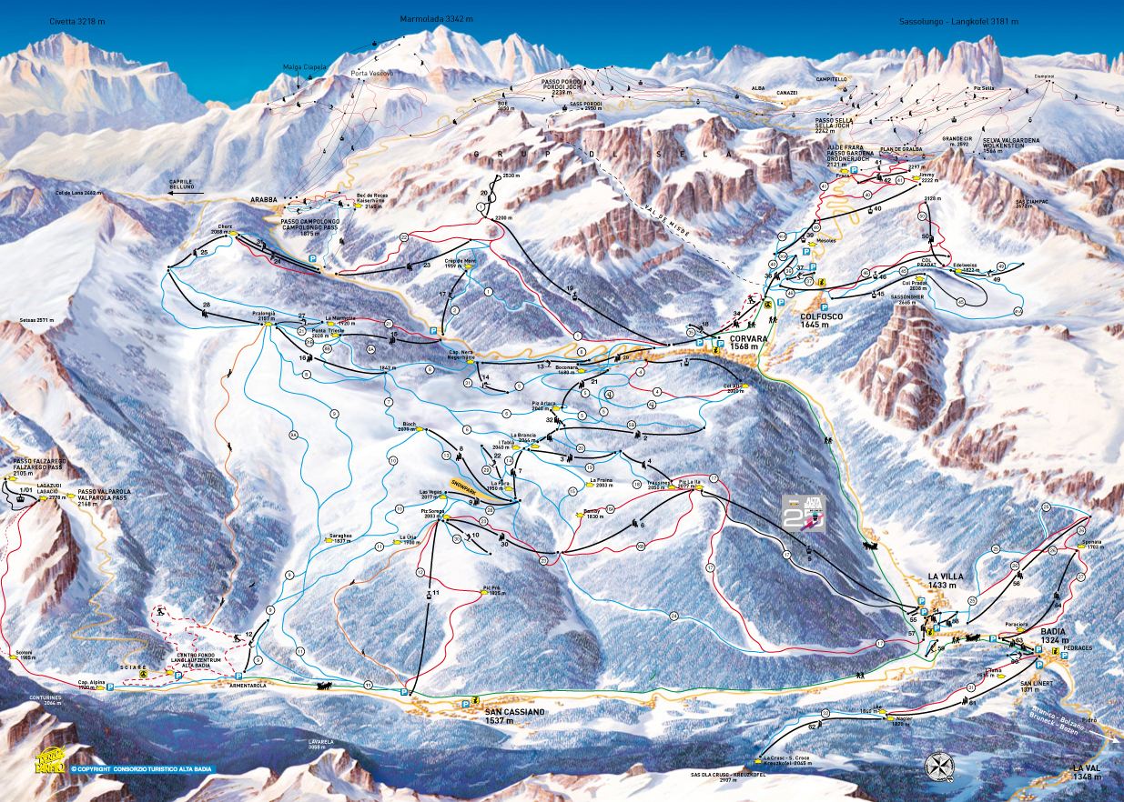 Pro nezkušené lyžaře a začátečníky jsou zde ideální nenáročné a hlavně široké sjezdovky, zejména v okolí středisek Corvara a Kolfuschg. Naopak zkušení lyžaři ocení náročné sjezdy vrcholů Vallon či Col Alt. Pro milovníky stylu freeride je pravým rájem údolí Mittagstal. Optimální podmínky pak najdou zejména v oblasti mezi Sass Pordoi a střediskem Colfosco. Lyžování nad Corvarou lze rozdělit do čtyř hlavních oblastí: Passo Gardena - Val Gardena, Arabba - Passo Campolongo, Corvara - Passo Campolongo - San Cassiano a San Cassiano - Campolongo.