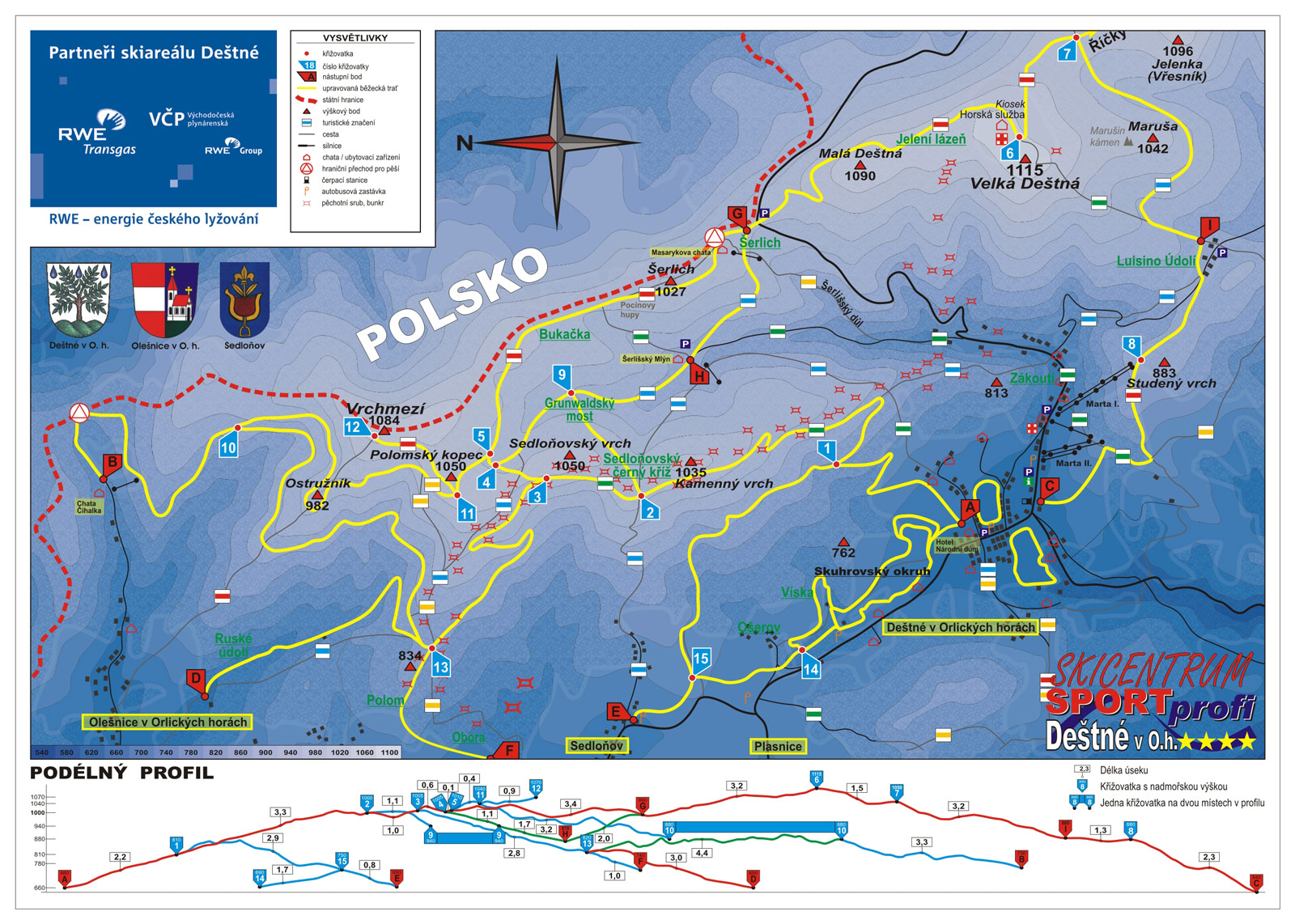 Malebná obec Deštné v Orlických horách se nachází, jak už název napovídá, v malebném pohoří severovýchodních Čech a rozkládá se v kotlině pod nejvyšší horou Velkou Deštnou - 1 115 m n. m. V současné době je Deštné (spolu s Říčkami) nejživějším a také i nejnavštěvovanějším střediskem zimních sportů a turistiky v Orlických horách. Lyžaři si mohou vybrat ze sedmi sjezdovek, které jsou jinak dlouhé a různě obtížné. Tyto sjezdové trati jsou pak umístěny na severních svazích a zároveň jsou i pravidelně udržovány. Zřejmě tou nejoblíbenější sjezdovkou je asi "Sportovní sjezdovka", která má délku 900 m a nabízí převýšení 210 m. Její plochý terén totiž umožňuje volit si nejen vlastní rychlost, ale i způsob jízdy. Samozřejmě, že zde naleznete i černou "Závodní sjezdovku", která je určena pro profesionální lyžaře. V areálu se opravuje, ale i půjčuje lyžařské vybavení a funguje zde i lyžařská škola pro úplné začátečníky. Ski areál Sportprofi Deštné v Orlických horách je dobře vybavené středisko zimních sportů. Na vrchol sjezdovek, které jsou kompletně pokryty zasněžovacím systémem, vás taktéž vyveze i sedačková lanovka. Pro vyznavače freestyle je zde velmi kvalitní a denně profesionálně upravovený Gravity snowpark, s mnoha skoky a překážkami. Velmi oblíbené je také večerní lyžování, které je v sezóně v provozu každý den od 18:00 do 21:00 hodin. Osvětlená sportovní (červená) a turistická (modrá) sjezdovka o celkové délce 2 100 m tvoří jedno z nejatraktivnějších večerních lyžování v celé České Republice. Přímo v areálu se nachází i velmi kvalitní škola nejen lyžování, ale i snowboardingu, pyšnící se osvědčením APUL. Jistě vás zde potěší i velmi rozmanité možnosti ubytování a stravování.