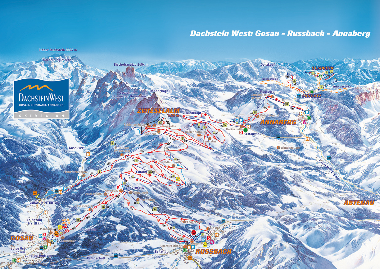 V lyžařském středisku Gosau, které je součástí lyžařské oblasti Dachstein West, si rozhodně přijdou na své zejména rodiny s dětmi, protože jsou zde jednoduché až středně obtížné sjezdovky. Kromě těchto dobře udržovaných sjezdovek si zde můžete užít i pěkných výletů po běžeckých tratí. Z Gosau také vede lanovka do vedlejšího lyžařského střediska Zwieselalm. Zde si také užijete fantastický výhled na nádherná panoramata Dachstein Glacier a nejkrásnější vrcholy Gosausee - Feuerkogel - Hochkönig. Z tohoto střediska se zase dostanete snadno do oblasti Dachstein West. Pro začátečníky, kteří hledají zábavu, se v Russbachu nachází Rookie park, vedle Bärencampu je zase pro děti k dispozici dětský koutek. Na zkušené lyžaře zde čeká Trailer Park, který kromě překážeky typu: Straight Rail (6m), Jib Box (4m), Curved Box (9m), Kinked Rail (6m) a Pro Kicker (15m) nabízí také volnou plochu, kde se můžete vyřádit zcela dle svých představ. Na Dachsteinu naleznete také 30 km rozlehlou Freesports Arenu (nejdelší trať měří 11 km ), na které lze jak snowboardovat a lyžovat, tak i provozovat paragliding, freeride, zimní turistiku atd. Celá oblast Dachstein West (780 - 2 100 m) je největší lyžařské středisko Horního Rakouska, která se částečně i rozkládá ve spolkové zemi Salcbursko (leží jen 60 km od Salcburku, v nádherné přírodě nad jezery). Je velmi často označována za nejkrásnější lyžařskou oblast, která je stvořena pro rodiny s dětmi, milovníky horského slunce a lyžařského umění. Nabízí tedy nejen nádherné panorama, ale vyznačuje se i širokou nabídkou sjezdovek pro začátečníky i opravdové znalce. Sjezdovky jsou zde většinou široké, ale najdeme zde i středně těžké sjezdovky, které vedou často hustými lesy. Ve vyšších polohách převažují spíše otevřené stráně. Lokalita nabízí díky své poloze v blízkosti ledovce Dachstein i stabilní sněhovou nadílku, takže o kvalitní sníh není nouze až do jara. Oblasti spojuje lyžařská "houpačka" Annaberg s Gosau, Russbachem a Zwieselalmem, které tvoří jádro této úžasné lyžařské oblasti.
