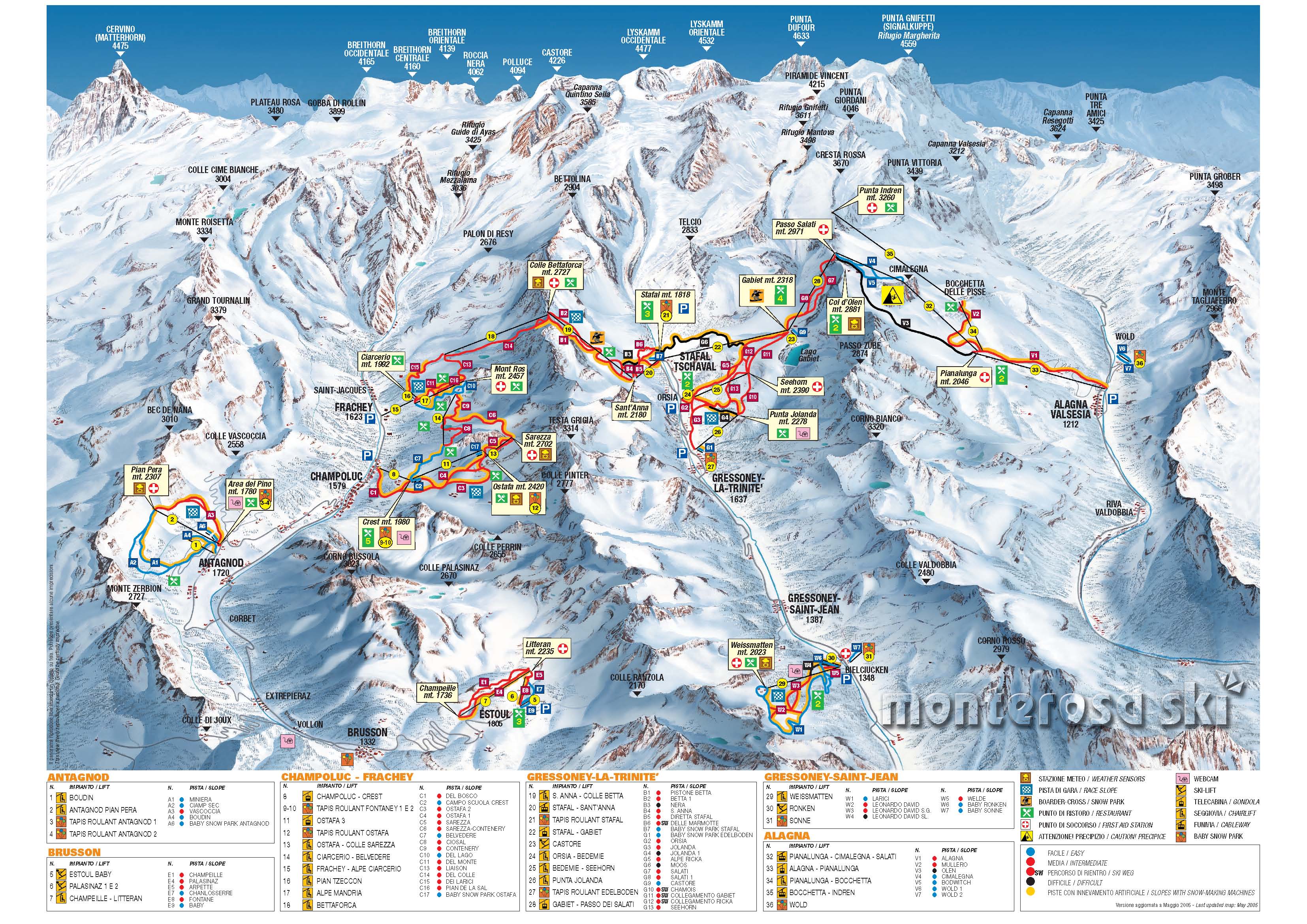 Gressoney La Trinité (1 635 m) se nachází v centru lyžařského areálu Monterosa Ski, kde si mohou zdejší návštěvníci zalyžovat například na Ayas-Valley (Champoluc) a Sesia-Valley (Alagna). La Trinité nabízí dohromady osm vleků, z nichž čtyři jsou umístěny mezi obce a osady Staffal, které jim tak umožňují rychle cestovat po různých lyžařských oblastí resortu. Sjezdovky se prezentují různým stupněm obtížnosti a většinou jsou vybaveny sněžnými děly. Gressoney La Trinité také umožňuje lyžovat ve vysoké nadmořské výšce, například na 3,5 km dlouhé sjezdovce na břehu jezera Gabiet. V celé Itálii také nenajdete jiné středisko, které by bylo proslulejší pro své off-pist terény. Zkušení milovníci lyží a snowboardů zde budou mít také těžkou volbu, středisko Gressoney la Trinité je velmi půvabné obzvláště kvůli nedalekým proslulým čtyřtisícovkám Walliských Alp a skupiny Mont Blanc. Nejen proto je Gressoney - La Trinité považováno za jedno ze tří hlavních letovisek Monterosa Ski oblasti - italský ekvivalent nekonečně slavnější oblasti Trois Vallées ve Francii. Lyžaři v Alagna se mohou přepravit moderní lanovkou z centra obce přímo do Pianalunga (nárůst o téměř 850 výškových metrů) a odtud rozhodnout, zda pokračovat novou lanovkou o dalších 850 metrů výše na Col d'Olen (2 881 m), aneb to, zda jet lanovkou na Bocchetta elle Pisse (2 396 m). Lyžování v Gressoney La Trinité... to jsou prostě zimní radovánky v nebeské výšce!