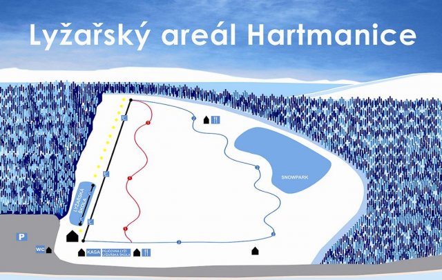 A na co všechno se můžeme v lyžařském areálu Hartmanice těšit a co nám nabízí? Vzhledem k tomu, že celý areál prošel rozsáhlou modernizací, najdeme zde 2 vleky s přepravní kapacitou až 800 osob za hodinu, 1 dětský lanový vlek, širokou sjezdovku (která je denně strojově upravována a to speciálně i pro večerní lyžování, které zde probíhá denně na osvětleném svahu), lyžařský svah orientovaný na severovýchod, systém technického zasněžování, osvětlení svahu a odbavovací systém (bezdotykové chipkarty). K dispozici je i snowpark, který nabízí 4 skoky, rail a box. Co se vybavení střediska týká, zapomenout nemůžeme ani na půjčovnu carvingových lyží, dětských lyží a lyžařských kompletů, včetně těch dětských. Samozřejmostí je zde poradenská činnost a doporučení nejvhodnějšího modelu a délky přesně pro vás a vaše děti. Výuku v lyžařské škole je nutné si sjednat dopředu a to přímo s hlavním instruktorem. Lyžařské středisko poskytuje individuální i skupinovou výuku pro děti i dospělé na lyže a snowboard. Skibus jezdí do střediska také každou sobotu a neděli a to na trase Plzeň - Železná Ruda - Hartmanice. Přímo u sjezdovky je rozšířená komunikace určená k parkování pro 40 aut, na kterou navazuje upravené parkoviště pro dalších 50 aut. Parkování je samozřejmě ZDARMA. V případě nedostatku místa je možnost dalšího parkování přímo v centru Hartmanic, které je vzdálené přibližně 150 m od areálu. Přímo v areálu se pak nachází i dvě rychlá občerstvení (u dolní i horní stanice vleku) s pestrou nabídkou nápojů i rychlých jídel, s možností posezení. V Hartmanicích je dále možnost navštívit i několik restaurací, z nichž nejbližší je vzdálena také 150 m od areálu.