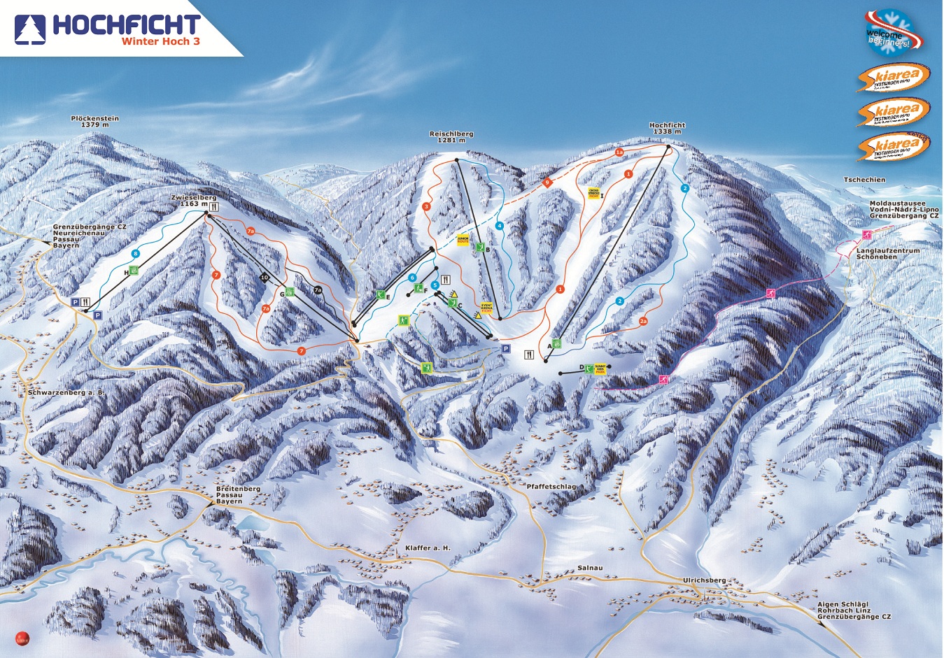Lyžařský areál Hochficht - Böhmerwald, který se rozprostírá na rakouské straně stejnojmenné šumavské hory, ležící na rakousko - českých hranicích, je rovněž známý pod svým českým jménem Smrčina. Sjezdovky lyžařského resortu se nacházejí v nadmořské výšce od 933 metrů do 1 338 metrů a kromě hory Hochficht leží i na sousedních kopcích Zwieselberg a Reischlberg. Se svým vysokým standardem služeb se lyžařské středisko řadí mezi nejlepší resorty středoevropského prostoru. Celkově je zde lyžařům k dispozici 20 km sjezdových tratí, přeprava lyžařů je zajištěna šesti vleky a třemi sedačkovými lanovkami, s přepravní kapacitou až 11 000 osob za hodinu. K lyžování slouží zejména jihozápadní a jižní svahy, které díky své orientaci a menší nadmořské výšce musí být pravidelně zasněžovány technickým sněhem. Při nedostatku sněhu se technicky zasněžují také sjezdovky Reischlberg a Hochwaldabfahrt, které jsou rozšířené zejména pro potřeby carvingu. Hochficht sice má obvykle spoustu přírodního sněhu, ale tímto opatřením se jistota sněhu ještě zvyšuje. Zdejší všechny sjezdovky jsou vybavené zasněžovacími zařízeními, které splňují nejvyšší technický standard. V areálu se nachází 3 kopce navzájem propojené vleky a deseti sjezdovkami. Mezi kopci tak vnikla unikátní lyžařská houpačka. Na západní straně Hochfichtu se nachází 2 sjezdovky, které tvoří centrum areálu: 2 km dlouhá červená Standardstrecke s homologací FIS a 3,4 km dlouhá modrá Zwieserwiese, které uspokojí i náročnější lyžaře. Obsluhovány jsou moderní odpojitelnou čtyř sedačkovou lanovkou. Na druhý kopec Reischlberg (neboli "Hraničník") se pak dostanete pomocí kotvy a až do výšky 1 281 metrů nad moře. Z jeho vrcholu vede červená a modrá sjezdovka. V polovině kopce také můžete odbočit na širokou modrou pláň se dvěma vleky, odkud je pak možné se vydat ke třetímu kopci - Zwieselbergu. Sjezdovky na něm najdete na všech jeho stranách, na východní straně je červeno - černá FIS sjezdovka Zwieselberg a také jedna červeno - modrá sjezdovka Zwieselberg Family. Západní strana je určena pro Schwarzenbergabfahrt, což je 1 400 metrů dlouhá a také dostatečně široká trať. U dolní stanice lanovky Schwarzenberg se pak nachází bezplatné parkoviště. Snowboardisté si pak mohou zařádit v novém snowparku, který je umístěný pod vrcholem Hochfichtu, vedle červené sjezdovky Standardstrecke. Těšit se také můžete i na boardercrossovou a skicrossovou dráhu a lyžařskou školu.