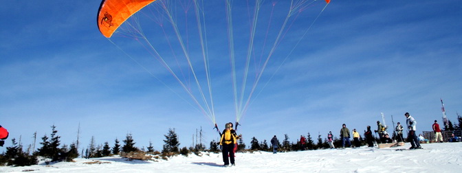 K mání je však celodenní výlet na saních, s osmikilometrovým sjezdem. Vyjedete kabinovou lanovkou na Černou horu, vylezete na Černohorskou rozhlednu (s dechberoucím výhledem do celého kraje) a pak sjedete na saních do Pece pod Sněžkou. Ten, kdo nemá program na večer, může zažít vzrušující noční jízdu z Černé hory po sáňkařské dráze. Čelové svítilny, saně, dopravu lanovkou a sáňkařského instruktora máte v ceně - zbytek už záleží pouze na Vás. Vyzkoušet zde také můžete let na tandemovém padákovém kluzáku, během kterého můžete obdivovat krásy Jánských Lázní z ptačí perspektivy. Kvalifikovaný tandemový pilot s vámi odstartuje z vrcholku Černé hory a po vyhlídkovém letu přistane na louce nad Černým dolem.