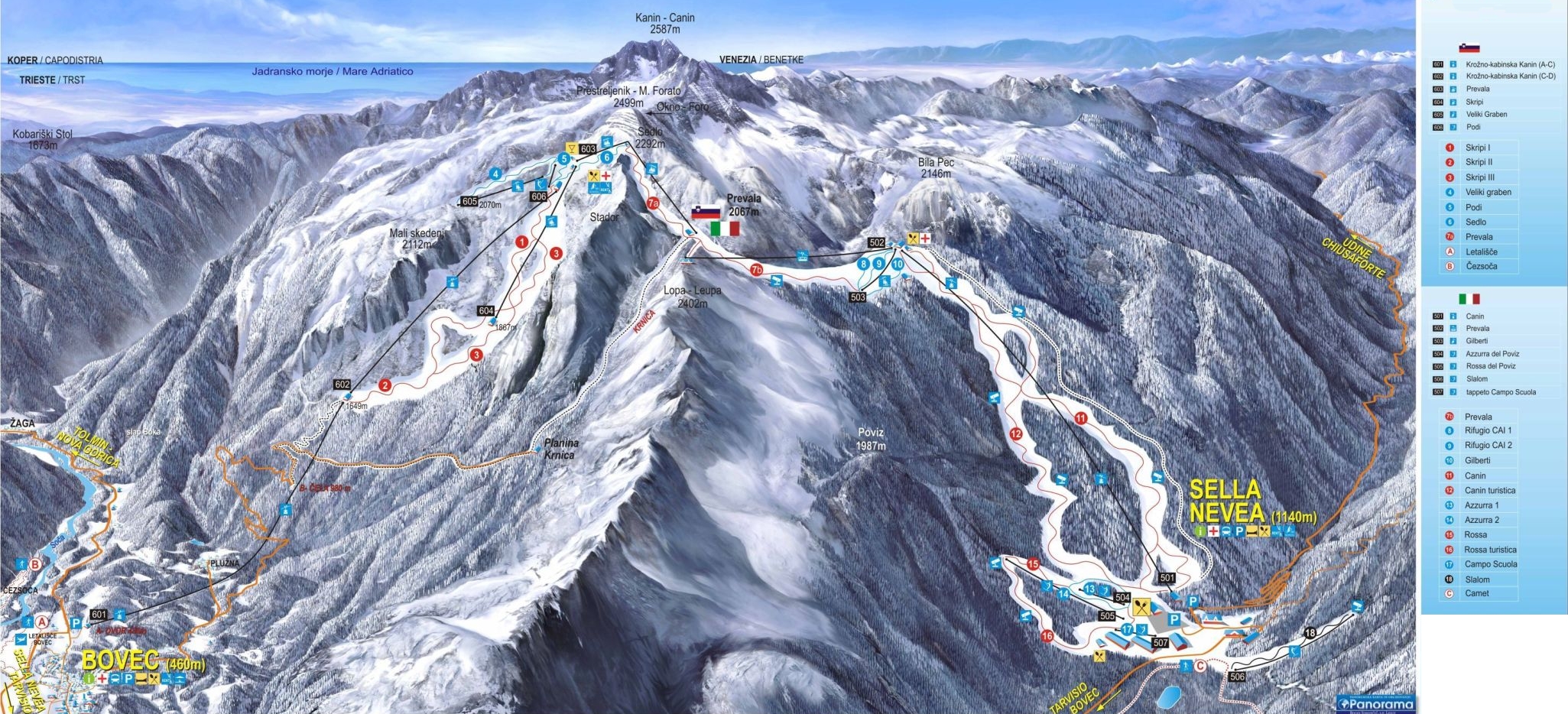 Masiv Kaninu je okouzlující, až majestátnou kulisou Julských Alp, která dokáže dojmout i lyžaře zmlsané Dolomity. Na italské straně leží již zmíněné lyžařské středisko Sella Nevea, s velmi sportovními sjezdovkami (pro svůj trénink je využívají i lyžaři Světového poháru), které navíc zatraktivnila visutá lanovka, jež jej spojila se slovinským Bovcem. Ten však ohromí ještě úchvatnější krajinou a zejména pak svými slunečnými, červenými sjezdovkami. Ze slovinské části areálu pak dohlédnete na Triglav i Jadran. Bovec je také ryze horský centrum a to i navzdory své malé výšce. Jeho zvláštní postavení a údolí otevření dolů směrem k Jadranu mu dává zvláštní kouzlo a rozmanitost, kterou byste jinde marně hledali. Influance z nedalekého pobřeží Jaderského moře se tu projevuje v poměrně mírné zimě, průměrná teplota ve městě v lednu je -0,2 ° C. V poslední době je zde dostatek sněhu v Bokovci na Vánoce spíše výjimkou, zatímco Kanin stále nabízí lyžování i během vánočních svátků. Kanin - Sella Nevea je první mezinárodní lyžařské středisko v regionu. Poté, co zde byla postavena nová lanovku a nová sjezdovka, se oba lyžařské areály spojily a přístupné jsou z obou stran hory Kanin. Se stejným skipasem tak můžete lyžovat na obou stranách hory, jak na slovinské, tak i italské straně. Sjezdovky se rozkládají na rozloze 70 hektarů a většinou dosahují lehké a střední obtížnosti. Na lanovkách a vlecích zde také nenarazíte na větší fronty. Díky nadmořské výšce svahy Kaninu téměř nezamrzají a nabízejí tak velké potěšení z lyžování na prašanu po celou zimní sezónu. Vyznavače lyžařských túr, telemarkového a freeride lyžování pak uspokojí výpravy se zkušenými průvodci a to i do sousedního údolí Krnica. Na vrcholu hory Kanin se nachází také nový snowpark, který zase dokáže uspokojit i zkušené snowboardisty. Takže i když lyžařské středisko dokáže potěšit i pokročilé lyžaře, stále je však skvělým místem pro ideální rodinnou lyžařskou dovolenou.