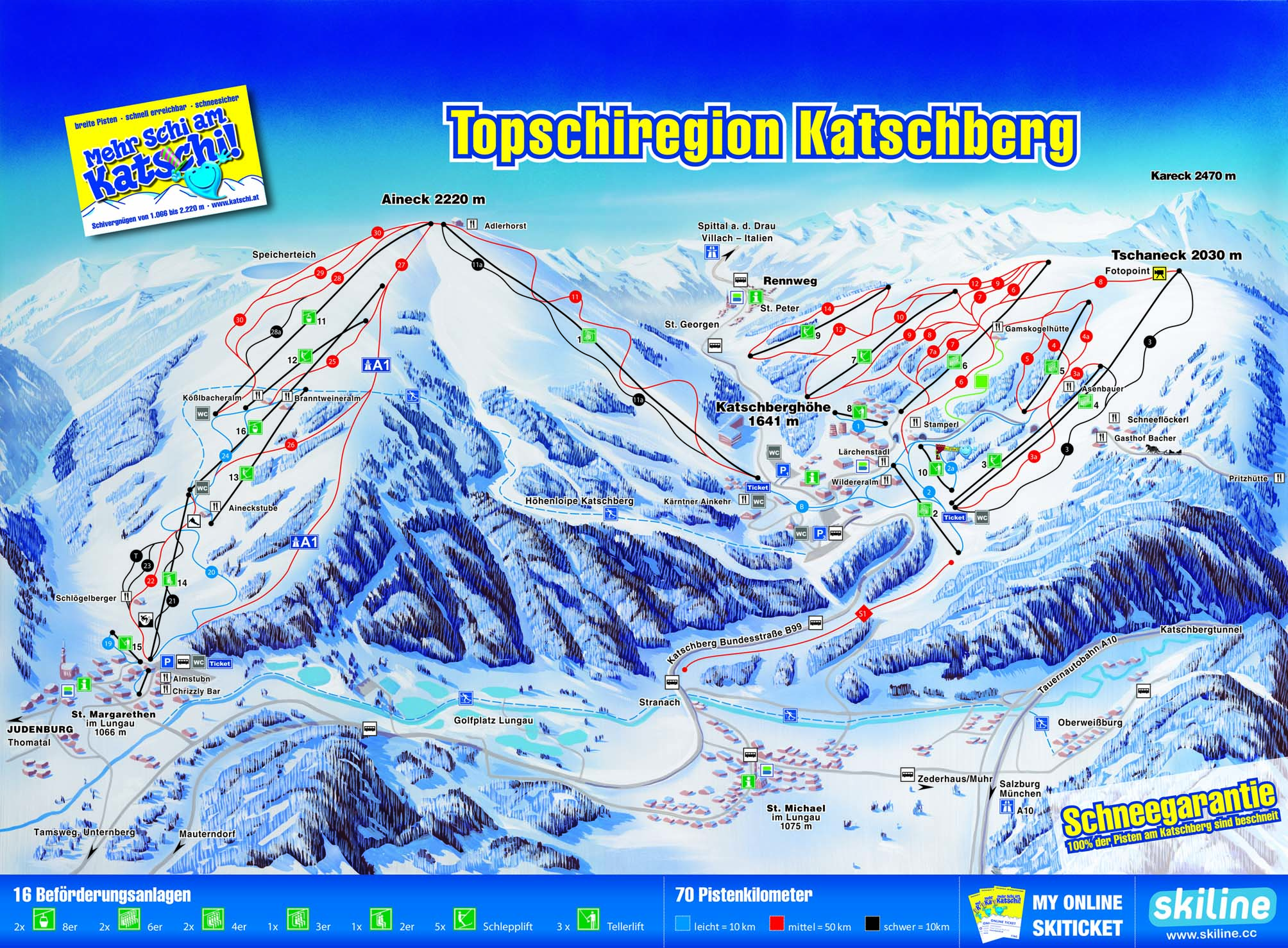 Relativně klidná a rozlehlá oblast Lungau se nachází v jihovýchodní části spolkové země Salcbursko a rozprostírá se na jihovýchodních, ke slunci orientovaných alpských svazích a to v nadmořské výšce od 1 100 m do 2 400 metrů. Lyžařská oblast Lungau sestává ze tří samostatných lyžařských resortů, kterými jsou Grosseck - Speiereck, Katschberg - Aineck a Fanningberg. Mezi nimi lze cestovat díky skibusu. Pro celou oblast Lungau platí jeden společný skipas a jednotlivá střediska jsou vzájemně propojena velmi důmyslným systémem skibusů. Skipas kromě regionu Lungau platí i v sousedních střediscích a nabízí tak lyžování na více než 300 km sjezdových tratí. Jedná se o skiregion, který nabízí celkem 70 kilometrů sjezdovek a to převážně vysoko v horách, na samé hranici spolkových zemí Salcbursko a Korutany. Síť sjezdovek tvoří převážně lehké až středně těžké tratě, všechny jsou však dokonale uměle zasněžovány. Vhodné sjezdovky tu najde opravdu každý - na vrcholku Passhöhe (1 641 m) na Katschbergu existuje velké množství modrých sjezdovek, které jsou vhodné především pro děti a začátečníky. Pro ně je pak připravena i široká "královská louka" (Königswiese). Do lyžařských středisek Aineck a Tschanek je vhodné propojení přes skokanský můstek, který nabízí pojízdný systém a který vás převeze snadno z jedné stanice na druhou. V případě potřeby pomoci je vám vždy na blízku zkušený a přátelský personál. V celé oblasti Lungau se pak lyžaři mohou těšit na celkem 147 kilometrů sjezdových tratí, na této sumě se nejvíce podílí 70-ti kilometrový resort Katschberg - Aineck, následovaný 47 kilometrovým střediskem Grosseck - Speiereck a Fanningbergem, který disponuje 30-ti kilometry sjezdovek. Ve všech třech resortech můžete počítat s lyžařskými školami a restauracemi přímo na svazích. Ještě zmíníme, že Katschberg - Aineck a Fanningberg mají svůj vlastní snowpark a noční lyžování si můžete dopřát v Grosseck - Speiereck a Katschberg - Aineck.