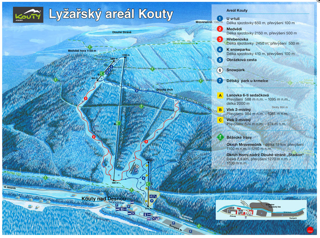 A co nám lyžařský areál Kouty nad Desnou vlastně nabízí? Tak je to již zmíněná první šestisedačková lanová dráha v ČR (3 200 osob/hod), 4 sjezdovky (z toho dvě mají délku přes 2 km, s ojedinělou šířkou přes 50 m), 2 moderní vleky, osvětlenou sjezdovku, zasněžovací systém s 30 děly (100% pokrytí celého areálu), dětský park vybavený pojízdným pásem a dvěma vleky, moderní snowpark a bezplatné parkování přímo v areálu (600 parkovacích míst). Celková délka sjezdových tratí činí celkem 11,5 km. Ve skiareálu také můžete využít 27 km nových běžeckých tras, které jsou položené nad 1 000 m .n. m. Zajímavostí je i místní skanzen - Koutecký les s výjevy historie Jesenicka. Nádherné prostředí okolo lyžařského střediska nabízí i možnost návštěvy horní nádrže elektrárny Dlouhé Stráně. V následujících letech je také plánováno rozšíření areálu o dalších 12 hektarů sjezdových tratí, s dvěmi čtyřsedačkovými lanovými drahami a čtyřhvězdičkovým wellness hotelem.
