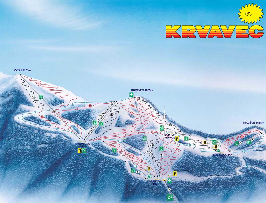 Nejvyšším bodem je vrchol Zvoh (1 971 m), uprostřed se nachází kopec Krvavec (1 853 m), podle něhož se lyžařské středisko jmenuje a nejnižší je Kržišče (1 655 m). Na horu Krkavec vede vlak z vesnice Cerklje. Na vrcholu Zvohu se pak také nachází zásobní jezero na výrobu technického sněhu. Na svahu z Kržišče na Krišku planinu najdeme starý skokanský můstek s odhadovaným kritickým bodem mezi 20 a 30 metry. V lyžařském středisku Krvavec také najdeme spoustu zajímavých lesních porostů, stejně jako bezlesých ploch, které asi nepodléhají každodenní úpravě svahů. Samozřejmě, že v Krvavci nemusíte jen lyžovat - můžete sáňkovat, zajít si do solária či sauny. Většina návštěvníků je ubytována v hotelech v Kranji, Lublani či Bledu. Čím se však lyžařský areál pyšní, jsou dva polygony. Jeden se nachází v Gospinca a představuje to nejlepší pro děti a lyžařské začátečníky. Obsahuje 80 metrů dlouhý dopravníkový pás pro děti, dětský kolotoč a různé vybavení dětských hřišť. Škola zimních sportů se nachází hned vedle polygonu a zahrnuje recepci a shromaždiště. Nedaleko se pak nachází také půjčovna a servis lyžařského vybavení. Navíc je nabídka pro děti a lyžařské začátečníky v této části lyžařského areálu doplněna o dětský vlek, který vás zaveze na sjezdovky u horní stanice lanovky. Polygon Gospinca se nachází v dolní části lyžařského střediska Krvavec, v bezprostřední blízkosti horní stanice lanovky (cca 50 m) a dolní stanice sedačkové lanovky. Druhý polygon se nachází v Kriška planina a poskytne nádherný zážitek pro celou rodinu. Ten obsahuje nejdelší vlek pro děti ve Slovinsku, který je 35 m dlouhý.