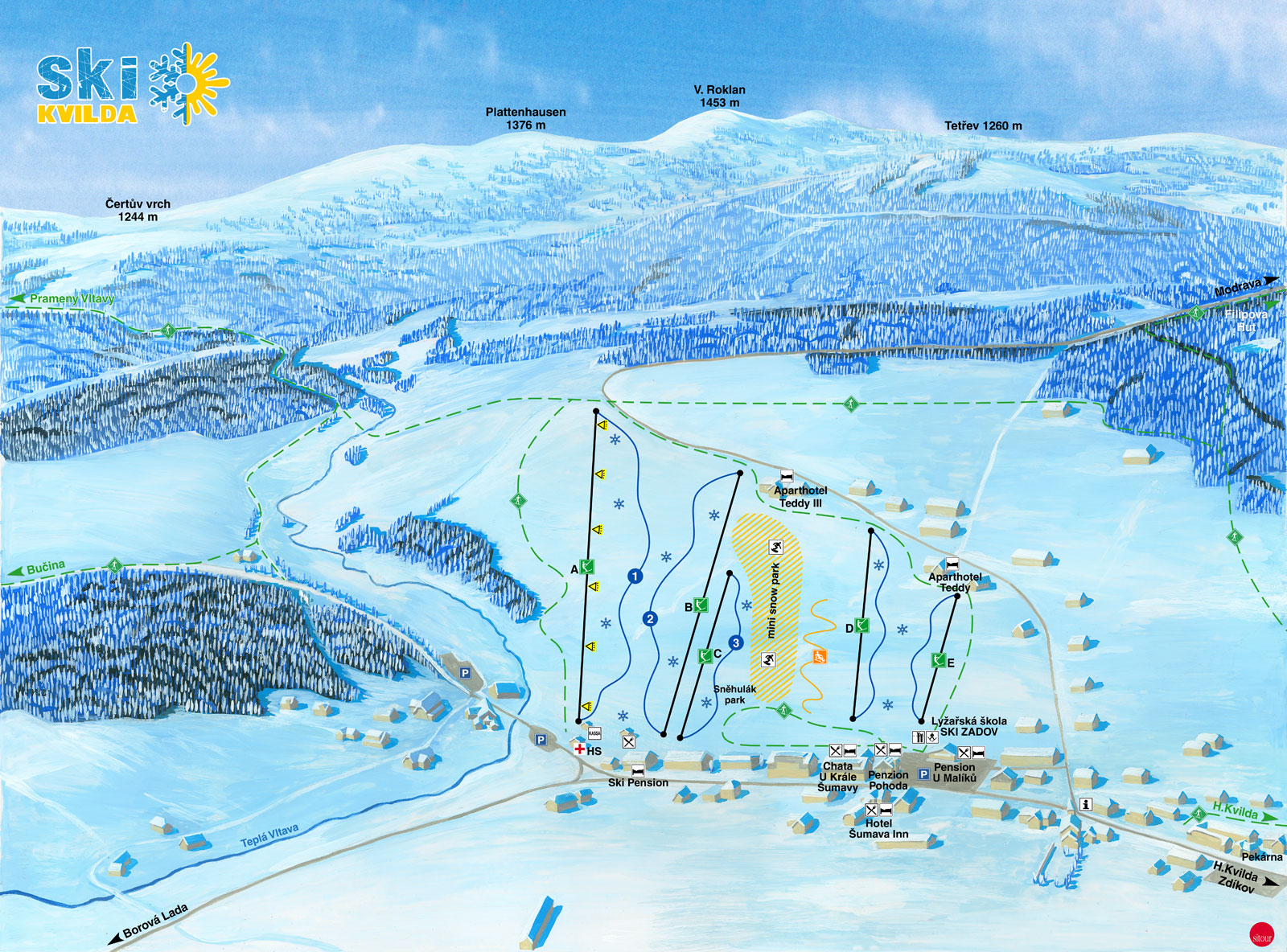 Lyžařský areál Kvilda, který leží přímo uprostřed obce nejen s dostatečnou kapacitou parkovišť, ale i míst v restauracích, je ideální pro rodiny s dětmi a začátečníky. Co se týká vybavenosti areálu, nabízí 3 veřejné lyžařské vleky (z toho 2 osvětleny), 2 neveřejné vleky lyžařské školy, zasněžovací systém (100 % plochy areálu je zasněžováno), lyžařskou školu s vlastními vleky, půjčovnu sjezdových i běžeckých lyží a snowboardů, servis lyží a snowboardů, elektronický odbavovací systém pro lyžaře, rolbu na úpravu sjezdových i běžeckých tratí, upravovaný svah pro sáňkaře a bobisty a v neposlední řadě i občerstvení přímo v areálu. V minulých letech se večerní lyžování konalo 1x týdně, teď je v provozu každý den. Ubytovací kapacita Kvildy je více než 1 000 lůžek, ale s okolními obcemi převyšuje 3 000 lůžek všech úrovní - od ubytoven až po 4-hvězdičkové hotely. V rekreačním středisku Kvilda najdete také i menší lyžařský areál vhodný pro lyžování s dětmi. K dizpozici jsou zde i dva lyžařské vleky Poma (270 m a 300 m), dětský provázkový vlek (100 m) a dětský lyžařský vlek s umělohmotnými úchyty (180 m). Ski klub Šumava v areálu Kvilda provozuje lyžařskou školu a snowtubing. Zařádit si můžete také v denně upravovaném mini snowparku, k dispozici jsou čtyři platformy: 1. platforma (sněhová dvojvlna - šírka 8 m, délka 30 m), 2. platforma (skok pro začátečníky - table 2 m), 3. platforma (mini rampa pro děti - šířka 10 m, délka 15 m, výška 2 m) a 4. platforma (rovná bedna 6 m s nájezdem - pro začátečníky, rovný rail 6 m s nájezdem - pro pokročilejší jezdce). Lyžařská a snowboardová škola SKI ZADOV nabízí komplexní služby týkajicí se výuky lyžování a snowboardu a to pro všechny úrovně a věkové kategorie. A to jak na Zadově, tak i na Kvildě. V duchu filozofie "to nejlepší pro nejmenší" najde ve středisku věková skupina 3 - 14 let velmi širokou nabíku kurzů. Děti mají zároveň k dispozici vybavenou hernu, kde probíhají další tvůrčí programy. A jelikož k příjemně prožité dovolené patří i kvalitní vybavení, tak co se týká lyžařského a snowboardového vybavení, najdete zde jak komplety pro dospělé, tak i velké množství dětských lyžařských kompletů. Pro vaši bezpečnost je možné si zapůjčit i helmy.