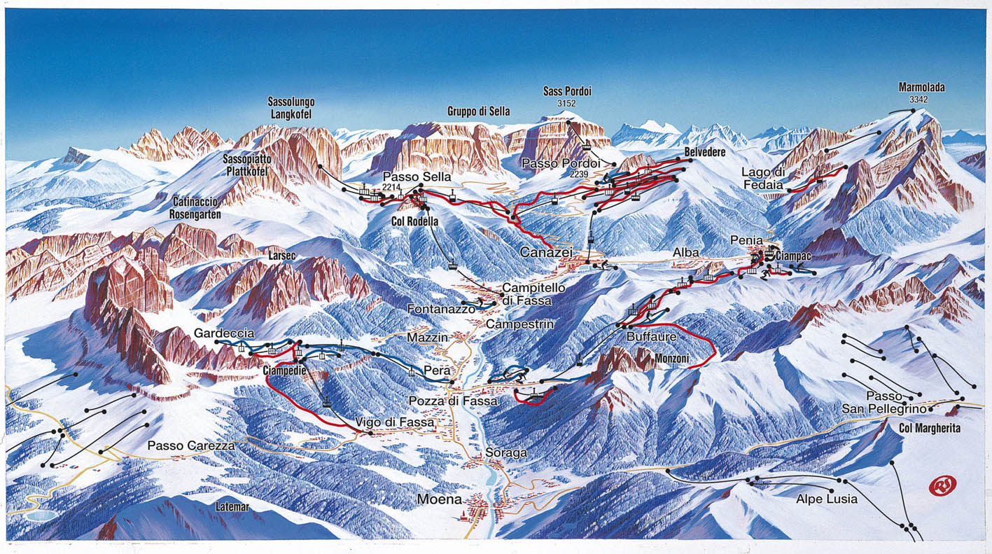 Pro všechny ty, kteří by chtěli začít lyžovat v Moena nebo v Soraga, pokračovat na svazích Lusia a San Pellegrino Pass, poté se přidat k Col Margherita a lyžovat v jedné z nejokázalejších oblastí Dolomit, je zde zdarma k dispozici skibus. Pro naše nejmenší, začátečníky, ale i zkušené lyžaře a experty jsou zde připravené svahy různých náročností a 60 km běžeckých lyžařských sjezdovek, které jsou "uhnízděny" v unikátní a nedotčené přírodě. Lyžařská oblast Moena je součástí lyžařské oblasti Trevalli, s přístupem k 113 jednotlivých sjezdovek. Kromě lyžování v Moena samotné umožňuje vhodný lyžařský Skipas lyžovat i v ostatních lyžařských středisek Trevalli - Falcade a Passo San Pellegrino. Moena nabízí 85 km sjezdovek, 80 sněžných děl a 8 lyžařských vleků, které přepraví 40 400 lyžařů a snowboardistů za hodinu. Resort MOENA - ALPE LUSIA - BELLAMONTE nabízí 50 nejmodernějších lanovek a vleků a více než 100 km sjezdovek, perfektně připravené od prosince do dubna. Tři vesnice: Moena, Falcade a Passo San Pellegrino jsou také umístěny v lyžařském areálu "Trevalli", v údolí Val di Fassa. Ski Trevalli Area je vysoce ceněn pro svou vynikající úroveň sněhu a údržbu svahů. Nabízí 27 vleků a přes 100 km sjezdovek. Rekreační oblast Alpe Lusia Ski Area nabízí dva přístupy: jeden od Moena (ve směru Passo S. Pellegrino) a druhý z Bellamonte (od Predazzo).