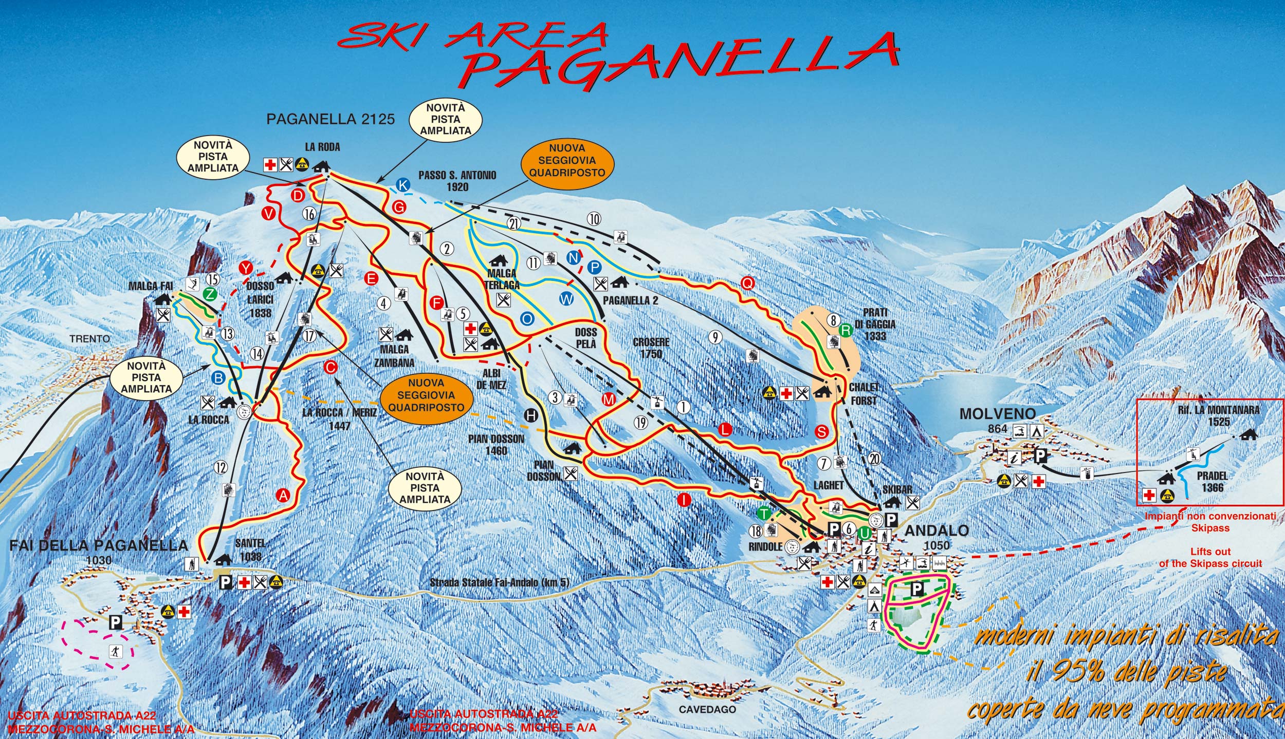 Lyžařský areál Paganella, který nabízí nespočet lyžařských vleků v moderním pojetí (téměř všechny lanovky byly v posledních letech nahrazené novými) je schopný uspokojit potřeby každého typu lyžaře. A to díky nejen středně obtížným a "černým" svahům pro zkušenější, ale i snadnějším, až středně náročným sjezdovkám, což je velice příznivé pro začátečníky, nelyžaře a rodiny s malými dětmi. Začátečníci zde mohou najít také čtyři výukové tábory, včetně dvou ve vesnici, vybavenými hrami pro děti. Nad vesničkami Andalo a Fai se na jeho severních svazích rozkládá síť 50 km lehkých až středně těžkých sjezdovek proplétajících se lesními průseky. Středisko však nenabízí žádnou infrastrukturu pro snowboard - samozřejmě kromě jízdy po sjezdovkách. Velmi vyhledávanou, záživnou, carvingově širokou sjezdovkou je Olympia s délkou 5 km a téměř tisícimetrovým převýšením. Nástupním místem do střediska jsou vesnička Fai a vesnička Andalo, odkud startuje moderní čtyřsedačka přímo do centra areálu. Nejprudším svahem je nově rozšířená, krátká, ale poctivě černá sjezdovka podél horní partie kabinkové lanovky z Andala a nejhezčí tratí je sjezd, který vede z vrcholu po bezlesém hřebeni a později nekonečným a lehce točitým průsekem do Fai. V lyžařském areálu Paganella, který může uspokojit požadavky všech, je platný Paganella Brenta Skipass, který je součástí skipasu " Dolomiti Adamello Brenta Skirama".