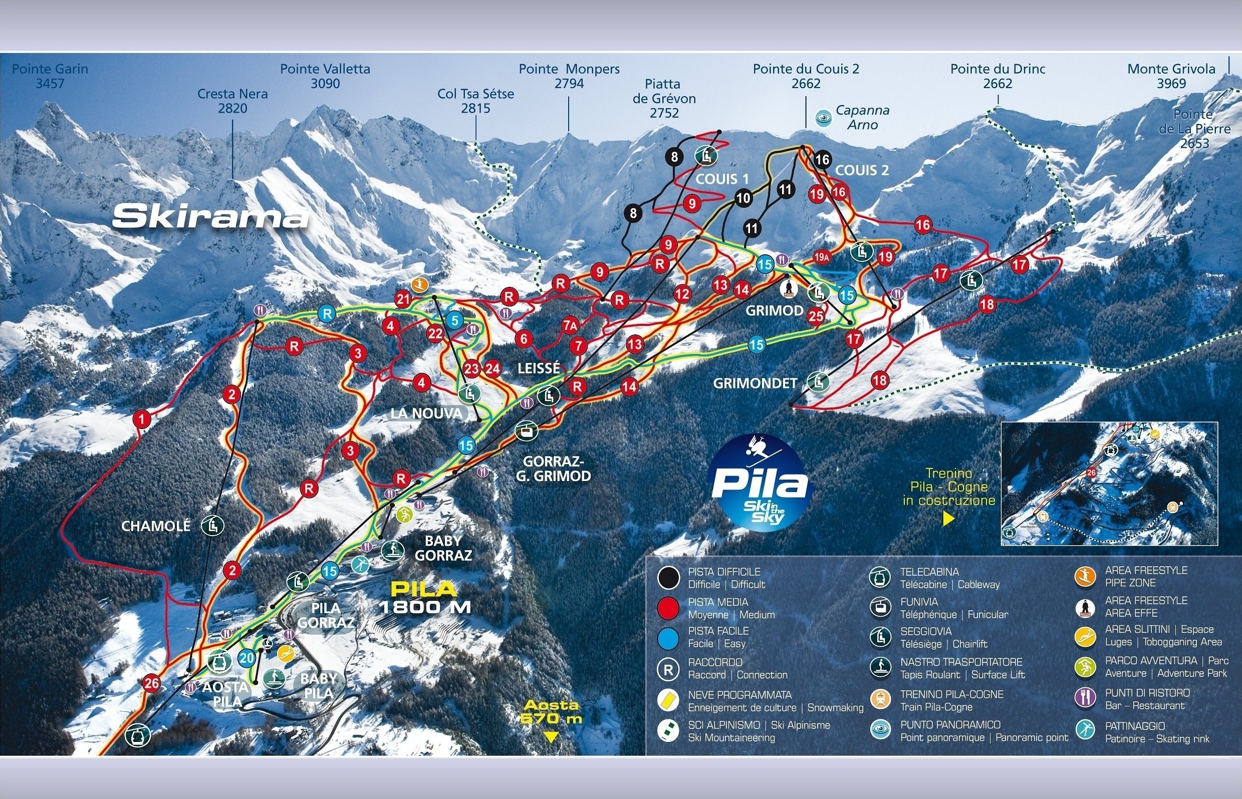 Pila nabízí kromě okouzlující přírodní krajiny s nádherným výhledem na Alpy (Mont Blanc, Monte Rosa a Matterhorn) také 70 kilometrů dokonale udržovaných sjezdovek (vedoucí nejen lesem, ale hlavně obrovským, širokým, otevřeným prostorem) a 400 sněhových děl, což znamená vynikající systém zasněžování. Pro začátečníky a méně zkušené lyžaře jsou oblíbeným místem sjezdovky na Grimod nebo Liesse run, které nabízejí vynikající lyžování. Děti najdou své snadné sjezdovky na Baby Gorraz. Na milovníky lyžování zde ale čeká celkem 38 sjezdových tratí, které se rozprostírají v nadmořské výšce od 1 800 do 2 740 metrů nad mořem. Nejdelší, takřka šestikilometrový sjezd, vám však dopřeje již zmíněná modrá trať jménem Grimod. Italská lyžařská oblast Pila je však součástí lyžařské oblasti Valle d'Aosta, s přístupem k 180 jednotlivým sjezdovkám. Kromě lyžování v Pila samotné vám vhodný lyžařský Skipas umožní lyžovat i v ostatních střediscích Aosta Valley Ski: v Alagna Valsesia, Breuil-Cervinia, Courmayeur, Crevacol, Etroubles a Saint -Rhémy-en-Bosses. Lyžařský areál samotný začíná od 1 500 metrů, ve výšce od 2 500 metrů je lyžování a snowboarding zajištěn v průběhu celé sezóny. V zimě 2010-2011 areál otevřel "New Black", který vede od Platta de Grevon (2 700 m) a klesá na Plan de L'Eyve.