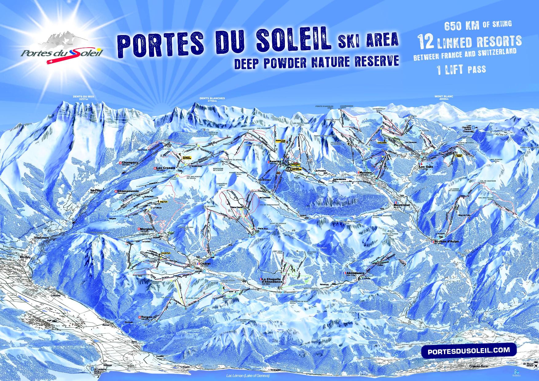Ve Francii jsou nástupními místy do lyžařských areálu městečka Abondance, Avoriaz, Châtel, La Chapelle d’Abondance, Les Gets, Montriond, Morzine a Saint Jean d’Aulps, ve Švýcarsku to jsou Champéry, Les Crosets, Champoussin, Morgins, Torgon a Val d´Illiez, které leží nad údolím řeky Rhony. Většina všech areálů je propojena lanovkami a vleky, pouze okrajové oblasti spojují pravidelně jezdící skibusy. Sjezdovky, které se nacházejí na švýcarské straně jsou všeobecně považovány za méně náročné, pouze areál Les Crossets (pod Pointe de Mossette) nabízí těžké sjezdovky. Náročnější tratě nabízí i francouzský Avoriaz, třeba 4 km dlouhou černou neupravovanou trať Crozats a další tři. Jednou z nich je např. "Coupe du Monde". Nabídka sjezdovek v ostatních střediscích je díky mírným svahům zejména vhodná pro začátečníky a rodiny s dětmi. Na své si v Portes du Soleil přijdou i milovníci snowboardingu, široká nabídka zahrnuje snowboardingové areály s U-rampami, skoky, raily a mnoha dalšími překážkami. Na švýcarské straně se nachází Superpark nad Les Crozets, menší fun park leží také i nad Champoussin. Na francouzské straně je pak k dispozici snowpark v Chatelu a v areálu Torgon se mohou těšit na boardercross. Nejširší nabídka pro snowboarding je však v Avoriaz - snowpark Arare a snowpark Chapelle. Menší funpark byl vybudován i v areálu Les Gets. Champéry samotné nabízí v současné době celkem sedm snowparků. Již zmíněná "Švýcarská zeď" je populární atrakce pro zkušené lyžaře, ale mějte na paměti, že zde bylo vážně zraněno nebo usmrceno již mnoho lyžařů. A vzhledem k tomu, že Champéry nabízí zejména střední svahy, dávají zkušení lyžaři raději přednost ostatním střediskům v regionu. Tím je i Avoriaz na hranici s Francií.