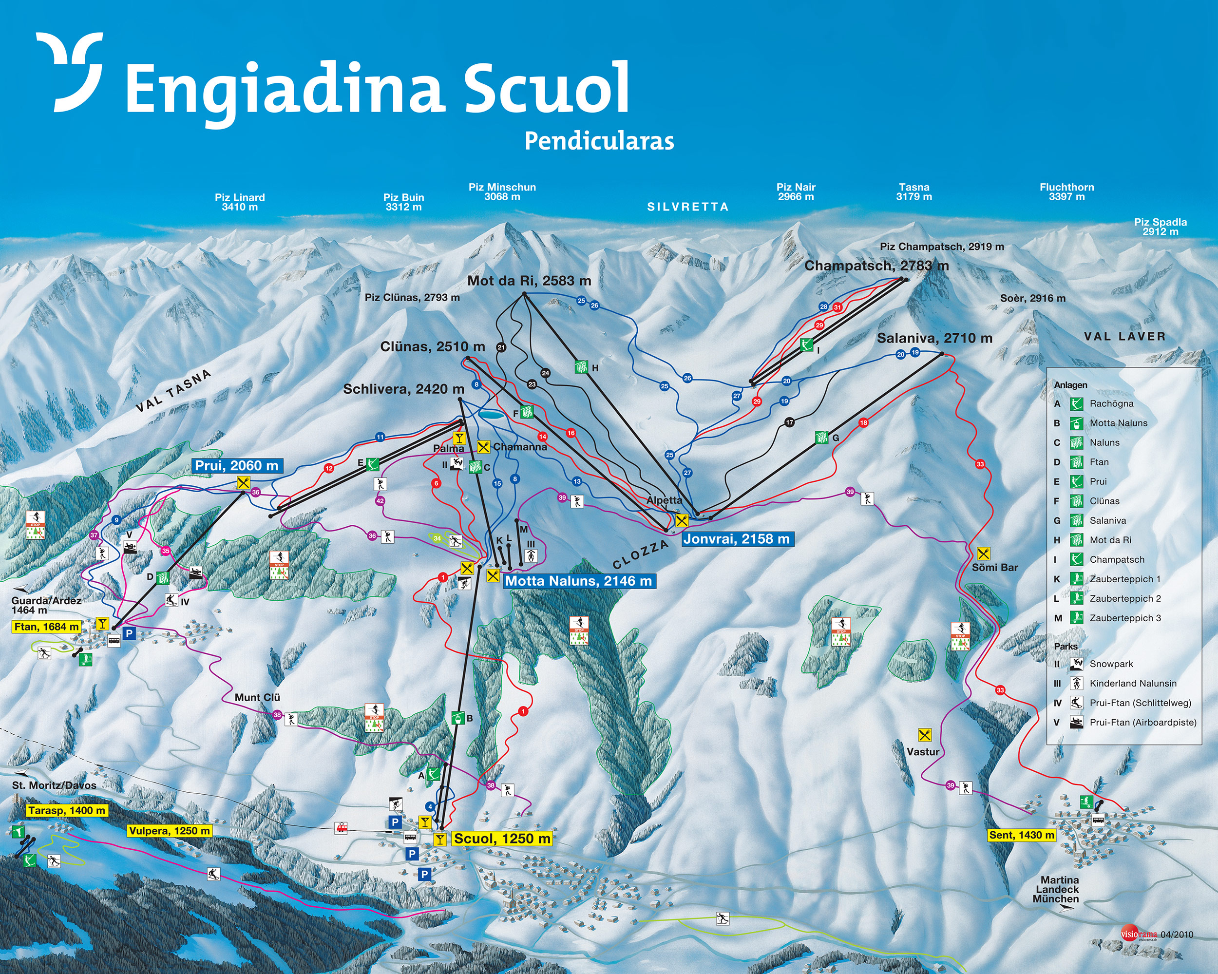 Romantická a idylická švýcarská vesnice Scuol, která je určená především rodinám s dětmi, je přímo ideálním místem, kde je možné se naučit lyžovat. Scuol - Motta Naluns je však také dobrá volba pro zkušené lyžaře, kteří si chtějí vyzkoušet klidné letovisko, se širokou škálou nedotčených "off-piste" sjezdovek. Lyžařské středisko, které leží nad Scuol (1 250 - 2 785 m) je opravdu něco zcela zvláštního. Využít lze jednu ze dvou gondol od Scuol nebo i sedačkovou lanovku z Ftan, aby jste mohli snadno a rychle dosáhnout tohoto zimního sportovního ráje. Tato lyžařská oblast zahrnuje 80 km sjezdovek, náročné svahy a strmé srázy, snadné mírné svahy přes modřínové lesy, ale i temperamentní hrbolatou sjezdovku nebo sjezdy v hlubokém prašanu. Je ideální pro lyžaře a snowboardisty všech úrovní. Součástí jsou i neobvyklé a atraktivní trasy, stejně jako velký dětský zábavní park s kouzelným kobercem, zábavní park boardercross a svahy airboard - speciálně vyvinuté pro airboarders. Nechybí zde ani rozsáhlá a pestrá freeride oblast, 3,5 km sáňkařské dráhy nebo 3 km sjezdovek airboard od Prui do Ftan. Středně velké švýcarské lyžařské středisko Scuol - Motta Naluns je obklopeno vrcholky Dolního Engadinu a Silvretta a je to sportovní areál, kde se můžete vyhnout dlouhým frontám. Je to malebná, tradiční vesnice v Dolním Engadinu, která neztratila nic ze svého původního kouzla. V Scuol najdete sjezdovky všech obtížností, většina z nich má však nízkou nebo střední obtížnost. V oblasti je pak velmi oblíbená jízda terénem v oblasti Salaniva - Champatsch-Salez.