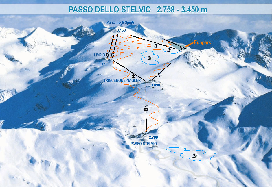 V nadmořské výšce 2 760 metrů, obývané pouze v létě, se nachází malé alpské městečko Passo Stelvio, které je současně nejvýše položeným střediskem s letním provozem v celých Alpách. Sedlo je dostupné pouze v létě (od konce jara do prvního sněhu) a to horskou silničkou vedoucí z městeček Bormio nebo Trafoi. V létě je možné lyžovat na ledovci ve výškách mezi 3 050 m a 3 400 m od stanice Livrio, kam se dostanete asi za 10 minut systémem kabinových lanovek. Na vrcholu vás však čekají pestré možnosti lyžování - mírné pohodové sjezdovky, sportovní svahy v oblasti Geister (často využívány jako tréninkové svahy s omezením provozu pro veřejnost), široká sjezdovka pro carving nebo krátký slalomový svah Nagler. Nabídku pak doplňuje park pro snowboarding s U-rampou a pro milovníky bílé stopy jsou zde připraveny tři běžecké okruhy ve výšce až 3 400 m. Nutno dodat, že i uprostřed parného léta jsou zde sjezdovky pokryty kvalitním sněhem. Takže v době, kdy teploty v údolí dosahují 40° Celsia, právě zde si můžete v klidu vychutnávat nádheru letního lyžování. A odpoledne ještě stihnout spoustu jiných turistických aktivit. Můžete se projít do Národního parku Stelvio, v červenci se zúčastnit srazu motocyklistů International Motorcycle Meeting nebo si jezdit na kole po trase Giro d´Italia.