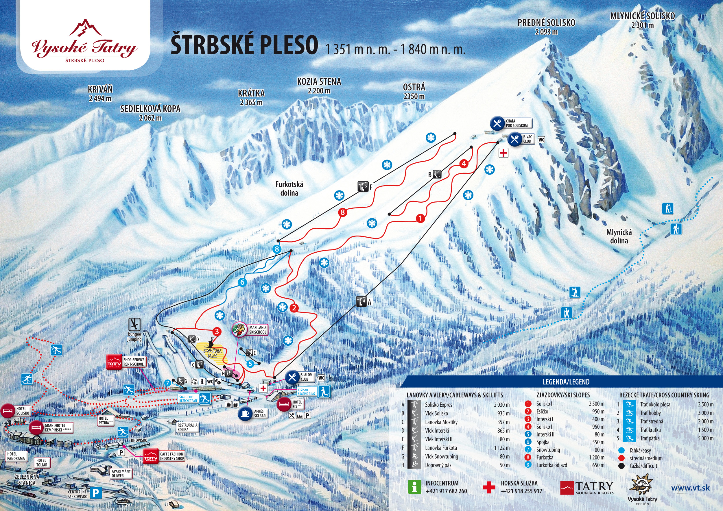 V lyžařském areálu se lyžuje převážně na jihovýchodních svazích Štrbského Soliska, které se nachází ve výšce 2 301 metrů nad mořem. Celkem zde najdete 5 sjezdových tratí střední obtížnosti - červené sjezdovky Esíčko, Solisko I. a II., Interski I. a Furkotka a dále 3 modré sjezdovky (Interski II., Spojka, Furkotka - dojezd). Původní dlouhou (ale lehčí červenou trať s expresní čtyřsedačkou) doplňuje právě již zmíněná nová, hravá červená trať Furkota s vlastní moderní sedačkovou lanovkou, nacházející se v horních partiích. Ve spodní části areálu se nachází krátký, ale široký a příjemně strmý svah Interski se starší sedačkovou lanovkou. Hlavním vlekem je tu čtyřsedačková lanovka, na níž navazuje kratší vlek s pomou. Nejdelší sjezdovka pak vede od výstupu z pomy dolů k plesu a její celková dělka činí 2 300 m, s převýšením 430 m. Celková délka sjezdovek je 7 km a všechny tratě jsou uměle zasněžovány. Ve středisku je k dispozici také jedna freeridingová zóna. V provozu jsou tu 3 lanovky a 4 vleky, o celkové přepravní kapacitě 4 800 osob za hodinu. Součástí areálu je také i skokanský můstek, nechybí zde ani lyžařská škola jak pro děti, tak dospělé. V půjčovně je možné zapůjčit si lyže, odvážnější mohou zkusit také paragliding a po náročném dni je příjemné využít i zdejšího krytého bazénu. Ve středisku se nalézá i snowpark s názvem Snow Vysoké Tatry, kde je možné vypůjčit si snowboardy. Od února 2009 je také snowboardistům zpřístupněn snowpark na levé straně svahu Interski, kde je připravena spousta překážek s možností jumpování. Určitě si nenechte ujít i večerní lyžování.