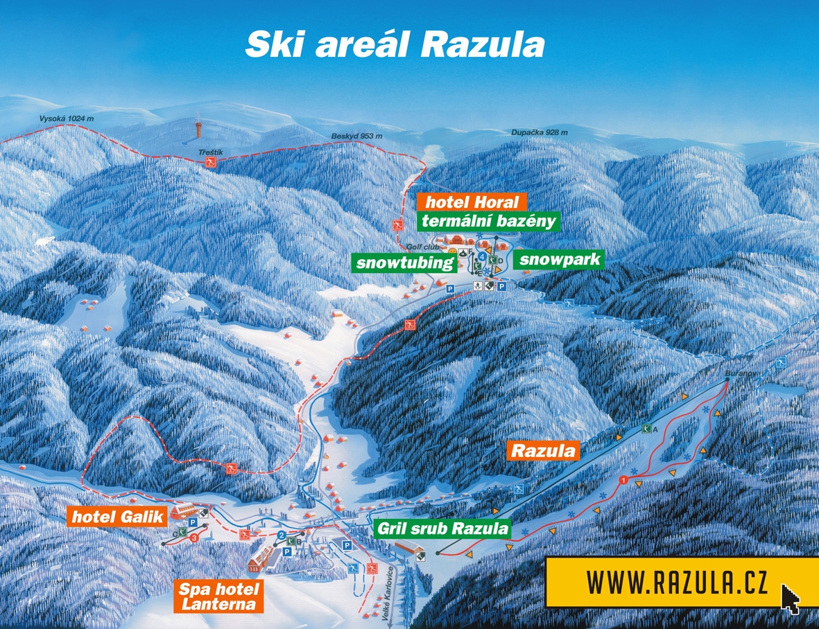 Lyžařský areál Velké Karlovice - SKI RAZULA, ideální pro celou rodinu, se nachází v obci Velké Karlovice - Léskové. Do areálu dopravuje své lyžaře skibus Razula, který jezdí každý víkend na trase Kroměříž - Zlín - Vsetín - Velké Karlovice. Cestujícím, kteří předloží jízdenku z úseku Kroměříž - Zlín - Vizovice - Vsetín - Karolinka do Velkých Karlovic, bude ve Ski areálu Razula výše jednosměrného jízdného odpočteno z celodenní permanentky. V případě využití vleku u hotelu Horal bude při zakoupení celodenní permanentky odpočteno 50 % z ceny jednosměrného jízdného. Areál se může také pochlubit i novinkami a těmi jsou sáňkařský svah u Hotelu Horal a GoGen mini snowpark na sjezdovce Razula (v závislosti na sněhových podmínkách). Lyžařský areál nabízí celkem šest lyžařských vleků s celkovou kapacitou 3 100 osob za hodinu a čtyři samostatné sjezdovky s celkovou délkou 1 950 m. Lyžařské svahy Razula a Horal jsou uměle zasněžované a denně upravované rolbami Kassbohrer. Již zmiňované noční lyžování probíhá na sjezdovkách Razula a Horal díky plně osvětleným sjezdovkám a vlekům a k dispozici jsou sjezdovky, jejichž orientace je: Razula sever, Horal západ, Galik východ a Lanterna východ. V nabídce areálu je k dispozici i nová opravna a půjčovna lyží, která zahrnuje profesionální stroje, vyškolený personál a široký výběr lyží a běžeckého vybavení. Lyžařská škola Horal má vybudované nové zázemí pod hotelem Horal. Každý den vám také budou k dispozici kvalitní instruktoři nejen pro vás, ale i pro vaše děti nebo výuku snowboardingu. Také je možnost domluvit si i individuální hodiny a přidat se tak ke skupinové výuce nebo nově k rodinné výuce. Na zimní víkendy jsou v areálu pro zpestření lyžování připraveny zajímavé akce, můžete si vyzkoušet testované lyže nebo si dát míchané drinky či grilované speciality. Nebo i snowtubing na svahu u hotelu Horal, což je sjíždění zasněženého svahu v upravené dráze na speciálních člunech. Nebojte se, na kopec vyjedete ve člunu taženého lyžařským vlekem. Délka tratě činí 250 metrů. Velké Karlovice také poskytují velmi dobré podmínky pro běžecké lyžování.