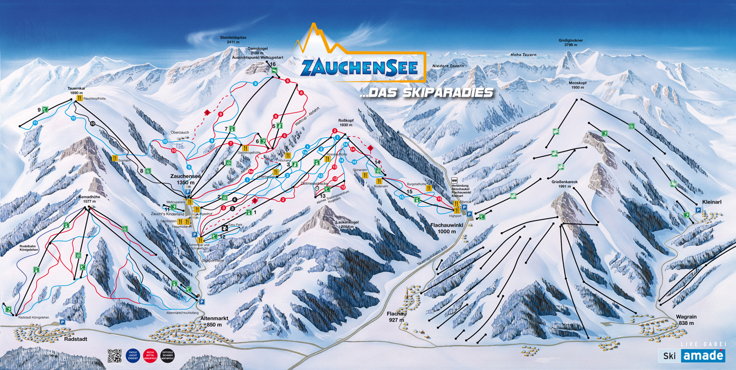 Oblast Zauchensee je součástí lyžařské oblasti Ski amadé, která nabízí celkem 860 km sjezdovek a 270 lanovek a vleků a která vám umožní přístup do světa neočekávaných možností v Salcbursku a Štýrsku. Od lyžařské houpačky přes čtyři vrcholky u Schladmingu, přes ledovec Dachstein v Ramsau, rozlehlý Salcburský svět sportu, Hochkönigs Winterreich a Großarltal až do údolí Gastein, si tak můžete vychutnat jak ledovcové sjezdy, tak i sjezdovky mistrovství světa a to zcela dle libosti. Počínaje mírnými svahy pro začátečníky, nezkušené lyžaře a rodiny s dětmi a rozhodně nekonče neodolatelnými možnostmi pro jízdu v hlubokém sněhu. A ten, kdo by se nechtěl vzdát zimních radovánek v překrásné přírodě ani po setmění, se může vydat na osvětlené sjezdovky do Flachau, Bad Gasteinu nebo Schladmingu. Milovníci snowboardingu se zase mohou těšit na pestrý výběr snowparků s mnohými atrakcemi, jakými jsou rampy nebo boardercrossy. K dispozici je také nekonečné množství zábavy, kterou nabízí lyžařský region Ski amadé! V regionu Flachau - Zauchensee se nachází několik dalších středisek. V samotném srdci lyžařského regionu Salzburger Sportwelt, se va výšce 842 m n.m. nachází Altenmarkt - idylická víska s pěknými kostely a kapličkami. Altenmark byl již několikrát dějištěm různých zimních sportovních akcí, mimo jiné i MS ve freestylu a Světového poháru ve sjezdovém lyžování. Do tohoto lyžařského střediska se dostanete přes lyžařskou houpačku Radstadt - Altenmarkt. V srdci Salcburska, uprostřed centra největšího lyžařského střediska Rakouska, se nachází Filzmoos. Ten nabízí jedinečný výhled na symbol městečka - Bischofsmütze, což v překladu znamená "bišovská čepička“, což je největší a zároveň nejkrásnější hora na hřebenu Gosau. Dalším střediskem je Flachau, které se nachází v nadmořské výšce 927 m nad mořem, kde vás na sjezdovkách bude sluníčko rozmazlovat již od samého rána. Ten je domovem nejen slavných mistrů světa Hermanna Maiera (lyže) a Manuely Rieglerové (snowboard), ale i dějištěm závodů světového poháru v alpském lyžování. No a zapomenout nemůžeme ani na Wagrain, který se nachází v nadmořské výšce 850 m. Čiperné městečko, které si i přes svou velikost ponechalo venkovskou idylu. Díky své poloze nedaleko lyžařské houpačky Flachau / Wagrain umožňuje perfektní vstup do lyžařského střediska s pestrými sjezdovkami a super snowparky.