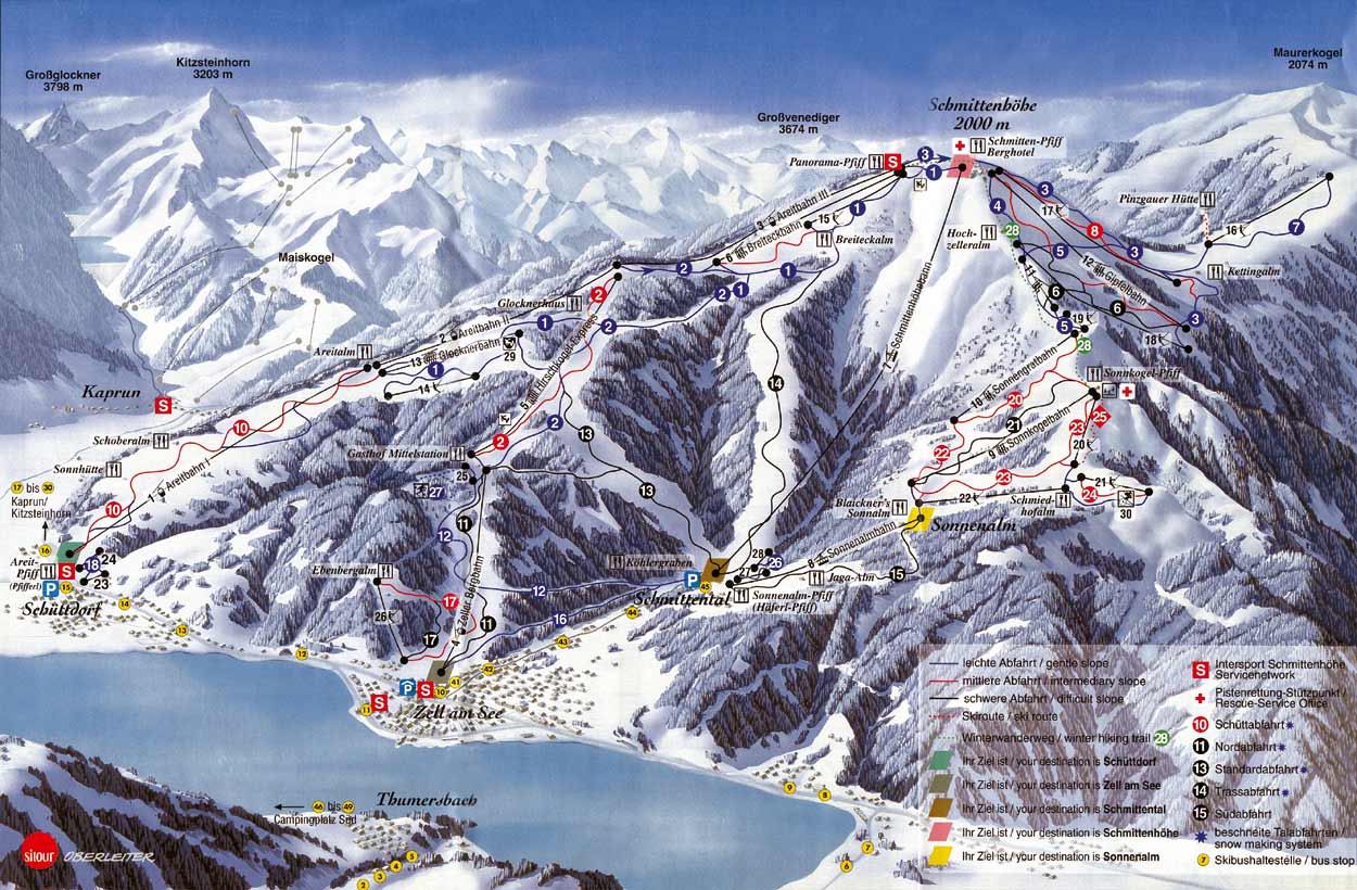 Lyžařské středisko Schmittenhöhe - Zell am See nabízí více než 77 km sjezdovek, téměř rovnoměrně rozdělené mezi modré, červené a černé sjezdovky, s vleky umístěnými na obou stranách obce. Zell am See je součástí Europa Sportregionu, ve kterém je zahrnut i sousední ledovec střediska Kaprun. Resort je umístěn poměrně v nízké nadmořské výšce, i přesto vás nejvyšší lanovka zaveze až do více než 3 000 m. Takže nikdy zde také nebude problém s nedostatkem sněhu. Vzhledem k tomu, že se středisko Kaprun nachází těsně pod úpatím vrcholu Kitzsteinhorn (3 203 m n.m.), stává se díky této poloze také oblíbenou ledovcovou oblastí, která umožňuje celoroční lyžování. Úchvatnou tratí je zde pak 3,5 km sjezdovka plná sluníčka Sonnenkarbahn, která vede přímo z vrcholu Kitzsteinhornu. Pro překonání výškového rozdílu 1 200 m je ideální nejdelší sjezd z ledovce do Langwieboden. Středisko Maiskogel je zase vhodné pro rodiny s dětmi. Ledovcové plochy samozřejmě lákají na Kitzsteinhornu, kde se nacházejí široké a rovnoměrné sjezdy. A pro náročné lyžaře je k dispozici např. Gletscher Park, Easy Park či Central Park. Středisku dominuje vrchol Smittenhöhe, ze samotného vrcholu až k Zell am See je možné si vychutnat 6 km dlouhou sjezdovou trať Trass. Pro děti si středisko připravilo zábavné programy nebo večerní sáňkování. Spoustu zábavy si také užijete ve fantastickým snowparku v Piesendorfu, ten se nachází asi 10 minut od Zell am See.